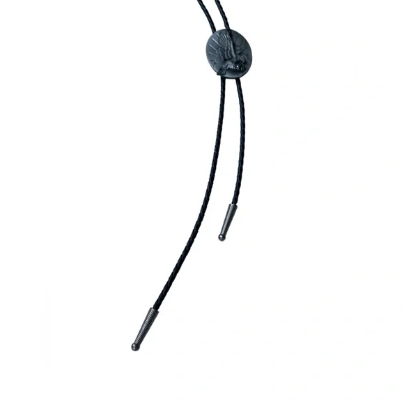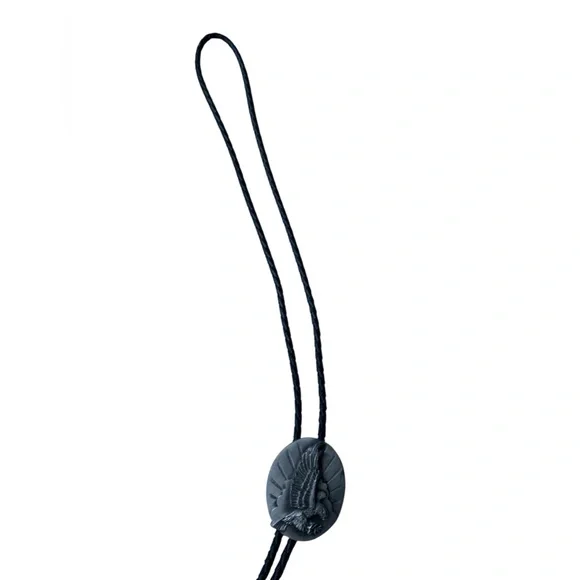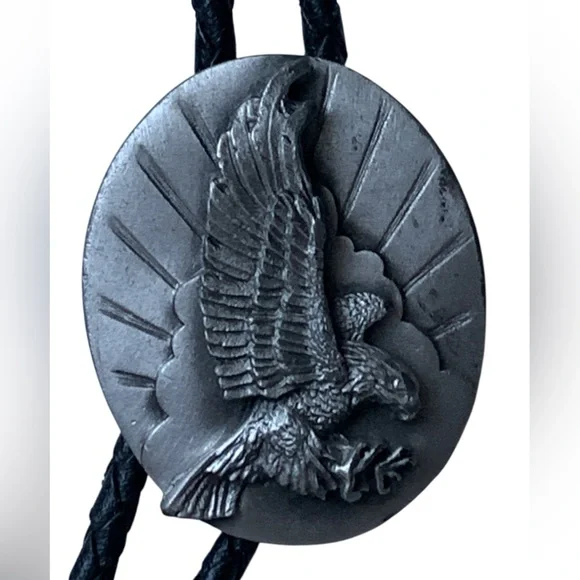 Vintage, some rubbing on the pewter & the back of the pewter has a bit of discoloring.Please see all photos, as they are a part of the description.Siskiyou Buckle Co Pewter, 3D Eagle Black braided Leather Bolo Tie Tags: black leather, braided leather, pewter, Eagle, bald Eagle, bird, silver, nature, Western, bikercore, biker, mountains, freedom, Harley Davidson, retro, 80’s, 1980’s, vintage, men’s accessories, tie, bolo tie, Siskiyou Buckle Co.